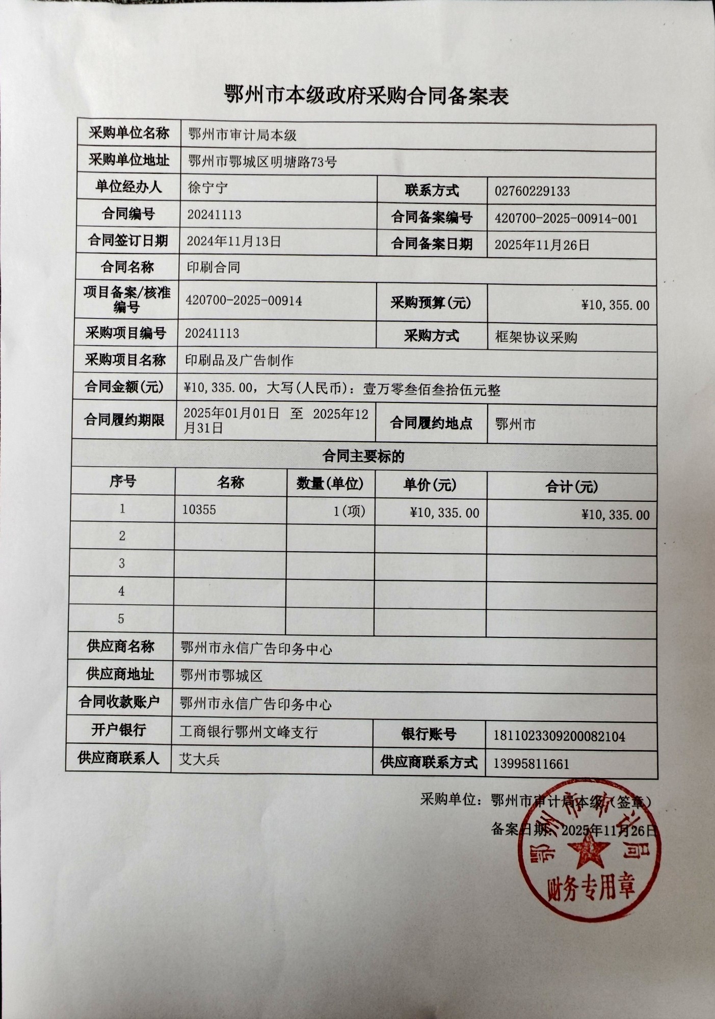 鄂州市审计局印刷品及广告制作合同备案表