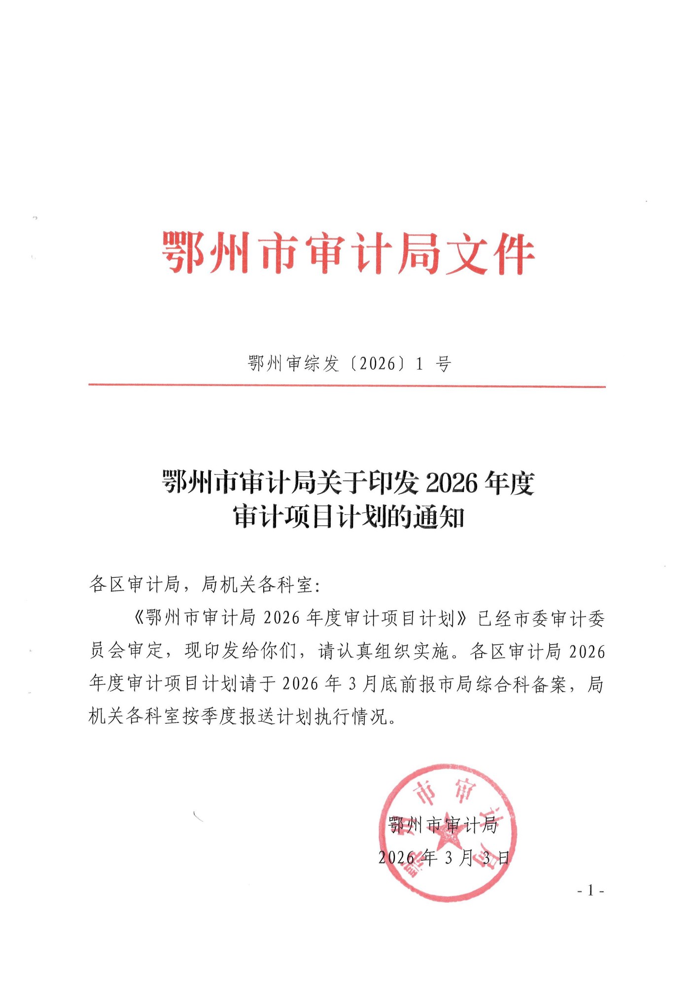 | 索 引 号: | 011217651/2026-00238 | 发文字号: | 鄂州审综发[2026]1号 | 发文日期: | 2026年03月03日 |